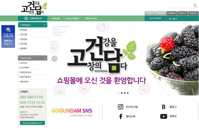 고건담 쇼핑몰은 복분자, 애플수박, 바지락, 장어 등의 농・특산품은 물론 연구소와 관내 업체에서 개발한 다양한 가공 제품을 판매 하고 있다.