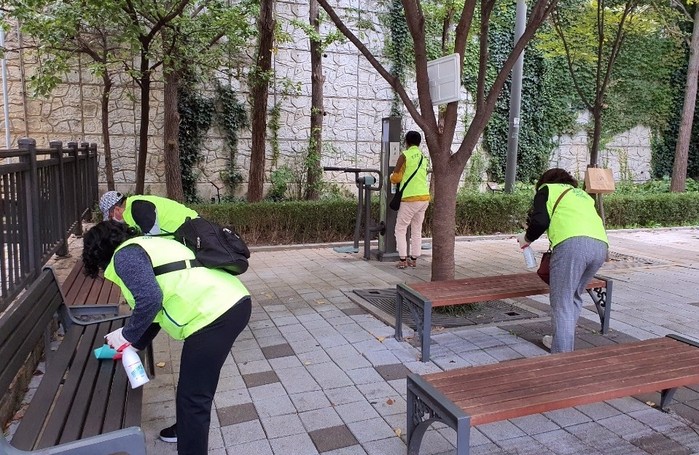 ▲지역 내 공원을 소독하고 있는 일자리 참여자들. 관악구 제공 |