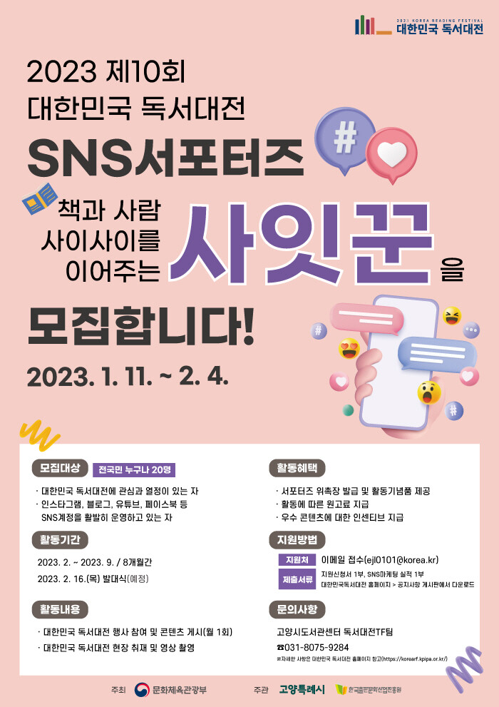 이동환 시장은 “SNS 서포터즈에 관심있는 분들의 많은 참여 부탁드리며 책의 도시 고양에서 열리는 독서대전이 대한민국 대표 책 축제로 나아갈 수 있도록 앞으로도 다양한 홍보방안을 마련할 것”이라고 말했다.