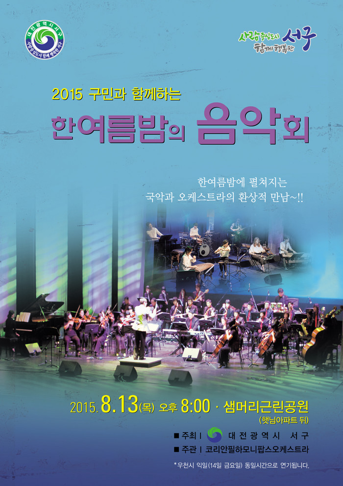 대전 서구는 오는 13일 저녁 8시 둔산동 샘머리공원에서 ‘2015 구민과 함께하는 한여름밤의 음악회’를 개최한다.