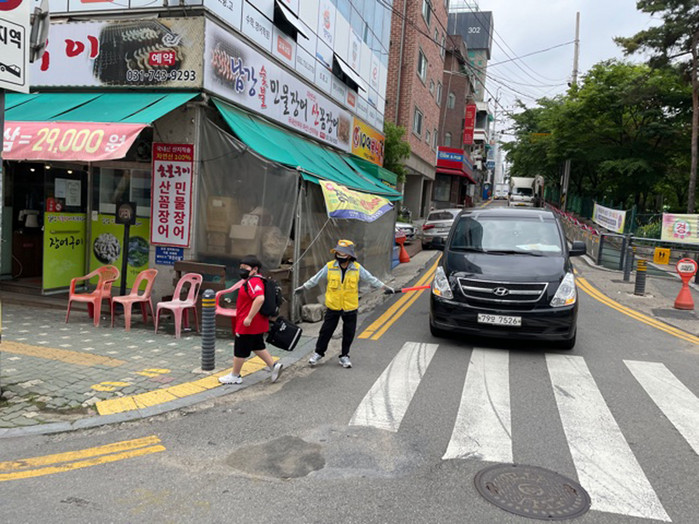 | ▲성남시민 순찰대원 초등학교 주변 횡단보도에서 어린이 교통안전 지킴이 활동 중. 성남시 제공 |