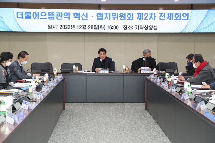 [로컬세계 = 임종환 기자]서울 관악구는 지난 20일 구정 최고 자문기구인 ‘더불어으뜸관악 혁신·협치위원회’ 전체회의를 개최해 민선8기 구정의 구체적 이행 계획인 ‘공약실천계획안’에 대해 논의했다고 21일 밝혔다.
