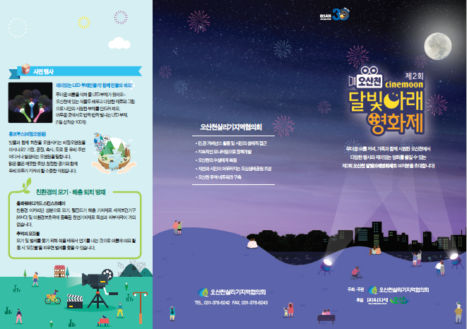 올해로 2회째를 맞는 오산천 달빛아래 영화제는 작년 시민들의 큰 호응에 힘입어 올해는 영화상영 뿐 아니라 나만의 LED부채만들기, 오산천 영상물 상영, 문화공연 등 더욱 다양한 콘텐츠를 가지고 도심 속 지친 현대인들의 심신을 힐링해 줄 영화제를 개최한다.
