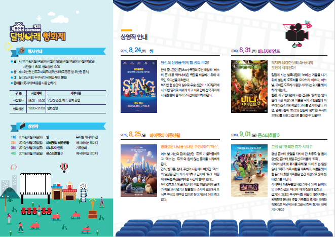 영화는 1회는 뮤지컬 애니메이션 ‘씽’를 시작으로 2회는 코미디 애니메이션 ‘마이펫의 이중생활’, 3회는 가족영화 ‘미니자이언트’, 4회는 코미디 애니메이션영화 ‘몬스터호텔3’을 상영할 계획이다.