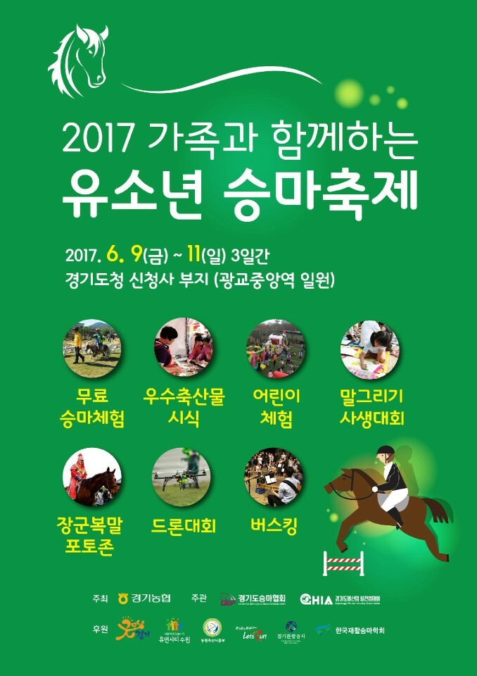 [로컬세계 주덕신 기자]경기도는 오는 9일부터 11일까지 사흘간 수원 영통구 소재 광교 경기도청 신청사 부지에서 ‘2017년도 가족과 함께하는 유소년 승마축제’가 개최된다고 5일 밝혔다.