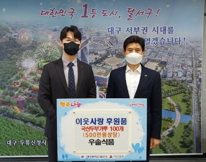 [로컬세계=박세환 기자] 대구 달서구는 지난 19일 우솔식품(대표 권오성)으로부터 국산두부가루(500g) 100개(500만원 상당)를 기탁 받았다고 21일 밝혔다.