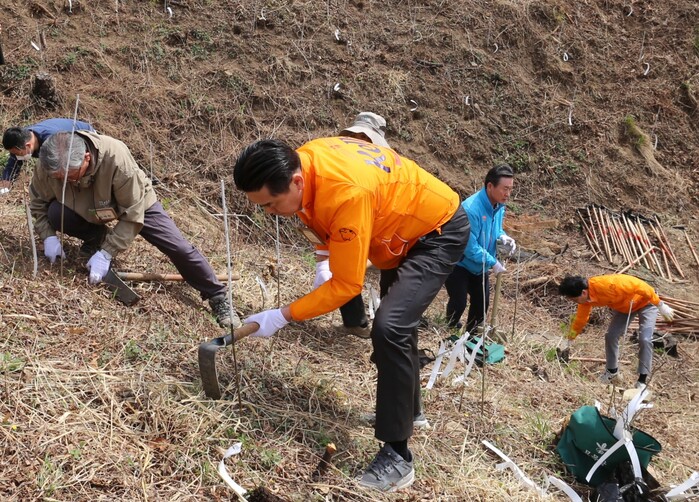 ▲김인규 하이트진로 대표이사(가운데)를 비롯한 하이트진로 임직원 및 협력사들이 강릉 산불피해지역에 나무를 심고 있다. |