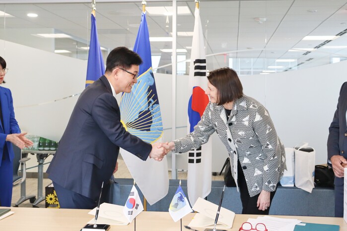 ▲ 고광효 관세청장(왼쪽)이 9일(현지시간) 미국 워싱턴D.C에서 미주개발은행 안나 마리아 이바네즈 부총재를 만나 업무협약을 체결하고 있다. 관세청 제공 |