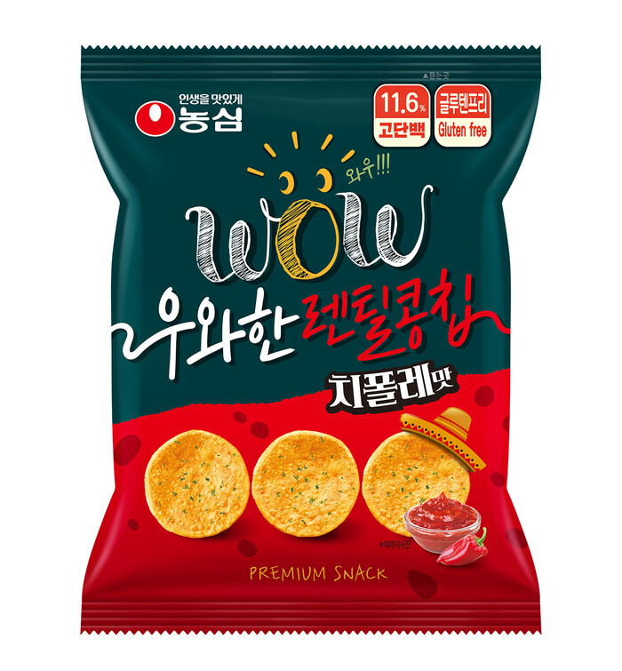 우와한 렌틸콩칩 치폴레맛은 맛과 영양을 함께 추구하는 소비 트렌드에 발맞춰 개발한 제품이다. 단백질과 필수 아미노산을 함유해 건강식품으로 각광을 받고 있는 렌틸콩 분말 함량이 39%이며, 단백질 함량은 11.6%로 기존 스낵의 2~3배에 달한다.