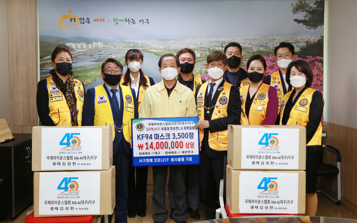 [로컬세계 박세환 기자]대구 국제라이온스협회 356-A지구 제3지역(부총재 한상천)는 지난 23일 서구청을 방문해 코로나19 극복을 위해 KF94 마스크 3500장(1400만원 상당)을 기탁했다고 24일 밝혔다.