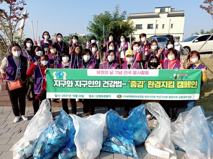 [로컬세계 김흥수 기자] 세계평화여성연합 충남도지부(회장 유순용)는 유엔의 날을 기념하여 지구와 지구인의 건강을 위하여 '지구와 지구인의 건강법, 줍깅' 환경지킴 캠페인을 지난 24일 아산 신정호 등에서 진행했다고 25일 밝혔다.