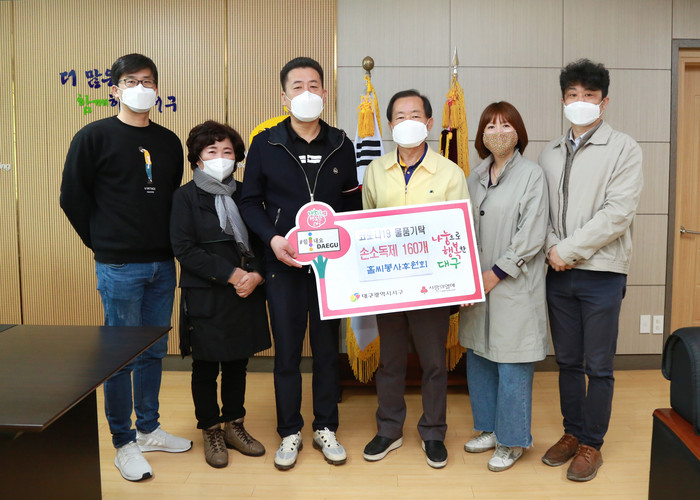[로컬세계 박세환 기자]대구 홀씨봉사후원회(회장 이수국)는 31일 서구청을 방문해 코로나19로 어려움을 겪고 있는 서구민을 응원하고 바이러스 확산 방지를 위한 손소독제 160개를 전달했다.