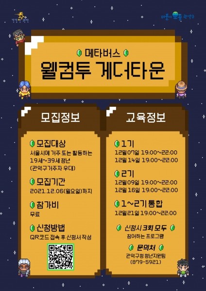 [로컬세계 임종환 기자]서울 관악구(구청장 박준희)가 2030 청년들을 위해 오는 12월 7일부터 메타버스 플랫폼을 활용한 '메타버스 웰컴투 게더타운' 교육 프로그램을 운영한다고 26일 밝혔다.