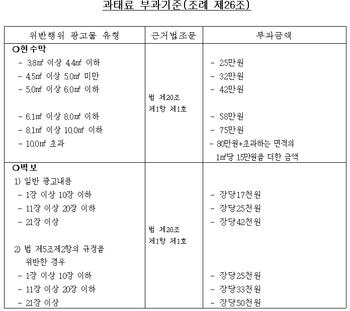 6일 시에 따르면 지난 7월부터 주말과 국경일에도 지속적으로 특별단속을 펼쳐, 11월 현재까지 불법현수막 575매와 불법벽보 740매를 발견즉시 강제 철거하고, 이 중 상습적으로 게첨(부착) 하거나 일시에 다량으로 불법 게첨하는 게시자(설치자 등)에 대해 옥외광고물등 관련법에 근거, 총25건에 175만원(현수막5건/125만원, 벽보20건/50만원)의 과태료를 부과했다고 밝혔다.