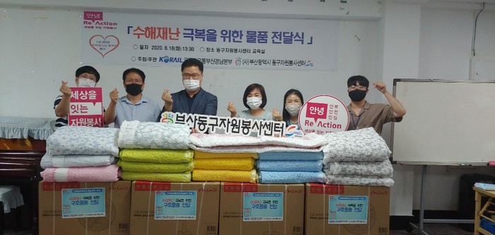 [로컬세계 맹화찬 기자]코레일유통 부산경남본부(본부장 정수용)는 지난 18일 수해재난 극복을 위해 (사)부산광역시 동구자원봉사센터(센터장 박명순)에 300만원 상당의 구호물품을 후원했다.