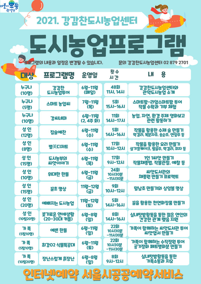 또한 모든 프로그램은 코로나19 감염 예방을 위해 방역수칙을 철저히 준수, 안전하게 진행할 예정이며, 프로그램과 관련한 보다 자세한 사항은 강감찬도시농업센터 또는 관악 도시농업지원센터로 문의하면 된다.