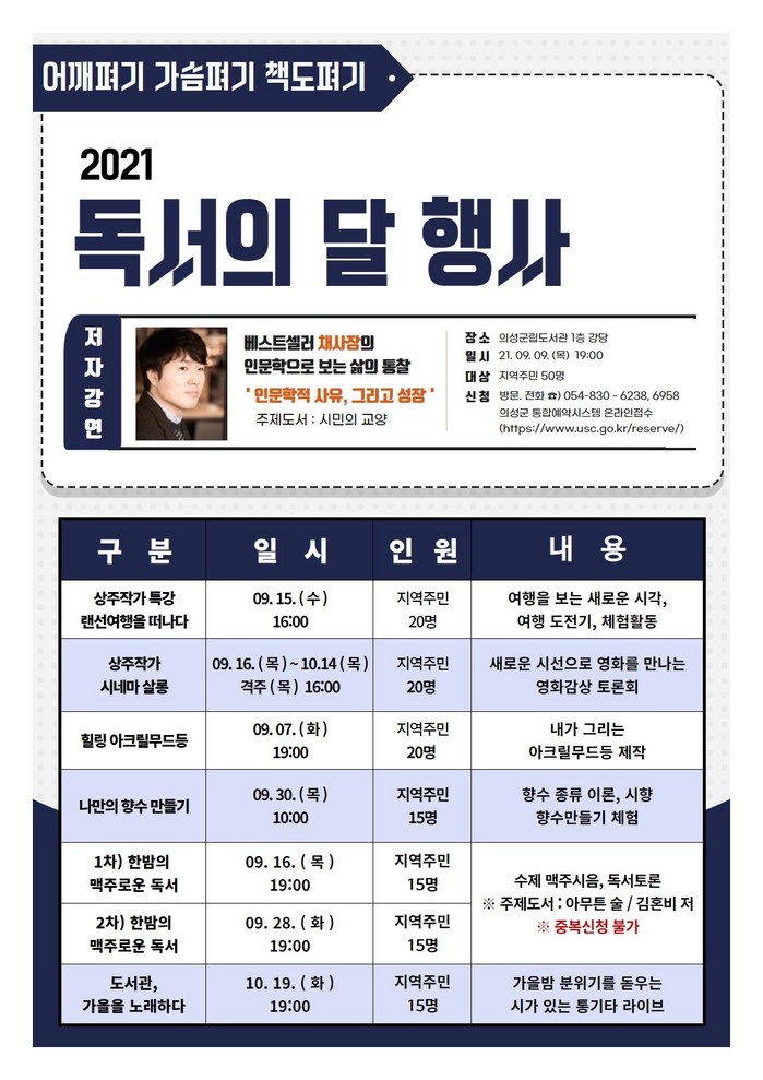 올해 독서의 달은 장기화된 코로나19로 지치고 힘든 지역주민들의 무거운 어깨와 마음을 달래며 책으로 위로를 전하고자 ‘어께펴기 가슴펴기 책도펴기’라는 슬로건 아래 7개의 다양한 독서문화 체험행사를 진행한다.