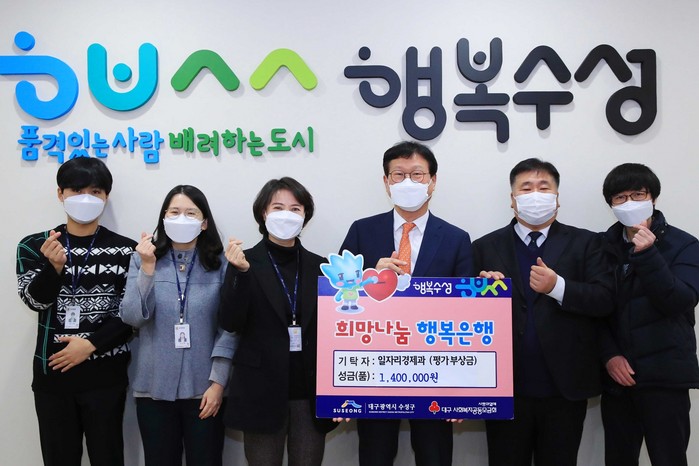 [로컬세계 박세환 기자]대구 수성구는 지난 18일 어려운 이웃을 위해 써달라며 ‘2020년 공공분야 일자리사업평가’ 포상금 140만원을 대구사회복지공동모금회에 전달했다.