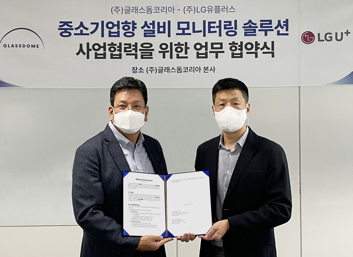 | ▲LG유플러스는 설비 모니터링 솔루션을 보유한 글래스돔코리아와 스마트팩토리 업무협약을 체결했다. 사진은 LG유플러스 서재용 스마트팩토리사업담당(왼쪽)과 글래스돔코리아 함진기 법인장(오른쪽)이 업무협약식에서 기념촬영을 하는 모습. |
