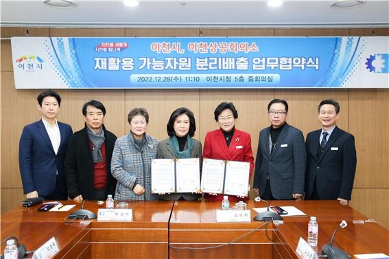 [로컬세계=김병민 기자]경기 이천시(시장 김경희)는 2022년 12월 28일 이천시청에서 이천상공회의소, 기업인 협의회 하이트진로 외 83개 관내 기업체와 재활용가능자원 분리배출을 위한 업무협약을 체결했다.