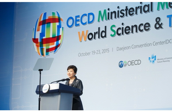 ▲ 박근혜 대통령이 지난 20일 오후 대전 유성구 대전컨벤션센터(DCC)에서 열린 ‘2015 경제협력개발기구(OECD) 과학기술장관회의’ 개회식에서 축사하고 있다.<사진출처=청와대 홈페이지> |