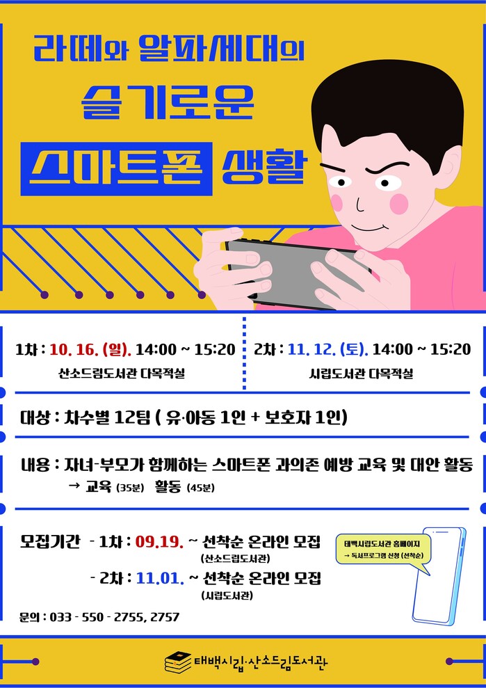 [로컬세계=박상진 기자] 태백시립·산소드림도서관은 오는 10월 16일과 11월 12일 양일간 유‧아동 및 부모를 대상으로 ‘라떼와 알파세대의 슬기로운 스마트폰 생활’ 프로그램을 운영한다.