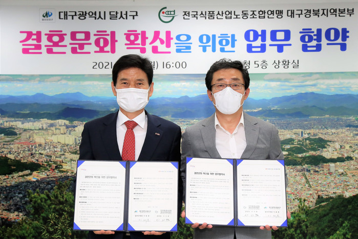 이번 협약은 지난 4월 구청에서 실시한 간담회에서 전국식품노조연맹 대구경북본부와 저출산 문제 해결을 위한 결혼장려 사업에 대해 양 기관이 그 필요성을 공감하며 체결하게 됐다.
