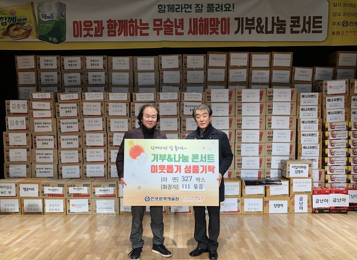 6일 군산시에 따르면 진포문화예술원은 지난 4일 ‘함께하면 잘 풀려요’라는 재능기부 형태의 콘서트에서 공연입장료로 들어온 물품과 문화예술을 후원하는 개인과 단체들로부터 기부 받은 성품들을 기탁했다고 밝혔다.