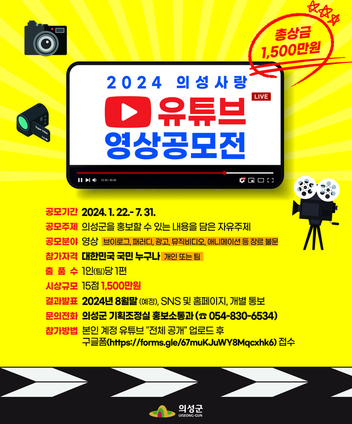 김주수 군수는 “2023년에 이어 두 번째로 2024 의성사랑 유튜브 공모전을 개최하게 되어 기쁘다”라며 “의성군의 다양한 행사, 축제, 관광, 문화 요소들을 담은 많은 영상들이 접수돼 의성의 색다른 매력을 확인하는 기회가 될 수 있기를 기대한다”고 말했다.