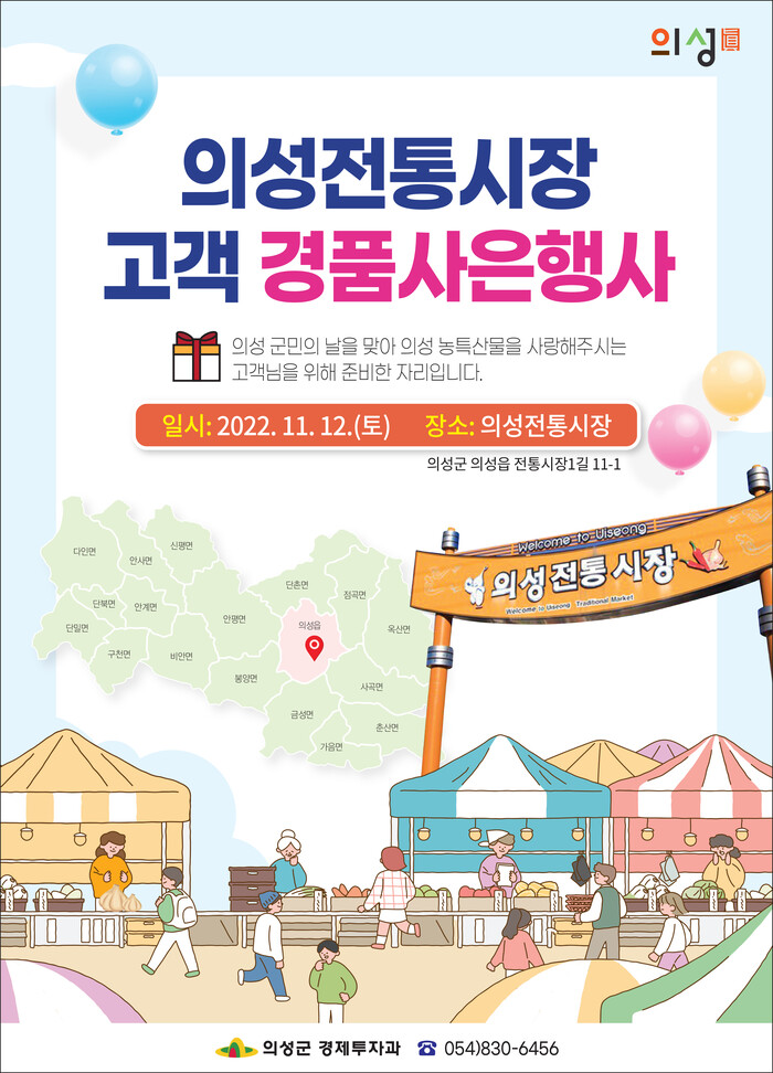 꾸준히 전통시장을 이용해 주시는 고객과 지역민들에게 감사의 정을 나누기 위해 의성전통시장 상인회와 함께 준비한 이번행사는 산수유 트롯장구, 초청가수 공연, 경품추첨 행사으로 구성되어 의성공설전통시장 내 채소아케이드 앞에서 오전 11시부터 오후 2시까지 진행한다.