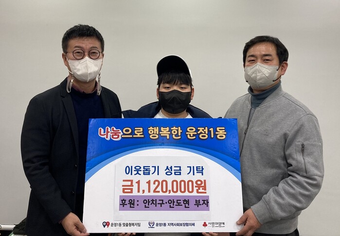 안치구(53세)·안도현(12세)씨 부자는 지난 9일, 파주시 운정1동 행정복지센터를 찾아 연말연시 어려운 이웃들을 위해 써달라며 이웃돕기 성금 112만원을 기탁했다.
