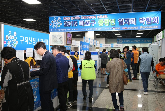 ▲지난 10월 22일 마포구청 1층 로비에서 열린 중장년 일자리 박람회에서 방문객들이 구직신청서를 작성하고 있다. |