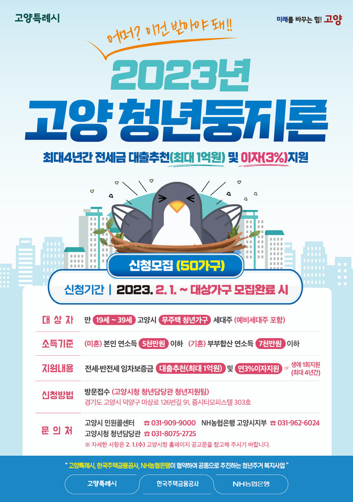 [로컬세계 = 이영원 기자]경기 고양특례시가 2월 1일부터 2023년 ‘고양 청년둥지론’ 사업의 지원가구 50가구에 대한 신청자 모집을 진행한다.