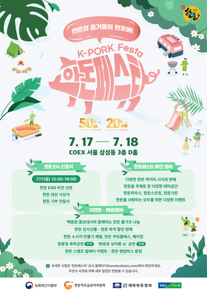 한돈자조금관리위원회(이하 한돈자조금)는 농림축산식품부, (사)대한한돈협회와 함께 한돈협회 태동 50주년 및 한돈자조금 창립 20주년을 기념해 오는 7월 17일부터 18일까지 서울 코엑스 D홀에서 양일간 열리는 K-PORK 한돈페스타의 슬로건, '한돈의 즐거움이 한곳에, 한돈페스타!'를 공개했다.