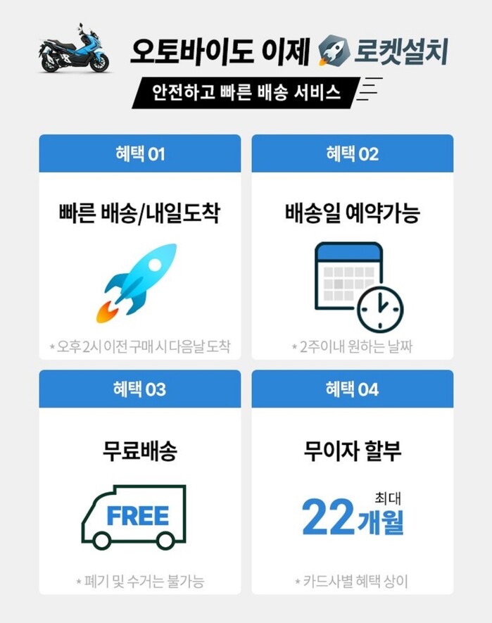 쿠팡은 성능 검사를 거친 오토바이와 스쿠터를 ‘로켓설치’ 방식으로 고객에게 선보인다. 오토바이를 주문하면 설치 전문기사가 안전하게 상품을 배송하고, 고객은 직접 오토바이를 확인하는 절차를 거쳐 인수하게 된다. 일반 제품과 달리 인수 완료 후에 단순 변심으로 반품과 환불이 어렵기 때문에 꼼꼼하게 체크리스트를 보며 전문기사와 제품에 이상이 없는지 함께 확인한다. 오후 2시 이전에 구매할 경우 빠르면 바로 다음 날 받아보거나 2주 이내 원하는 날짜로 배송일을 지정할 수 있다.