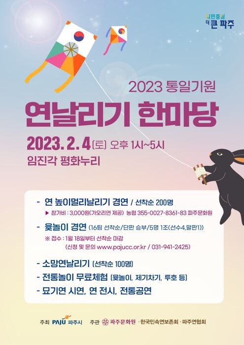 [로컬세계 = 이영원 기자]경기 파주시(시장 김경일)는 오는 2월 4일 임진각 평화누리에서 ‘2023 통일 연날리기 한마당 행사’를 개최한다.