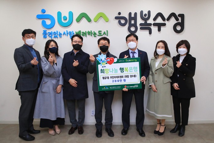 이에 김대권 수성구청장은 “뜻깊은 성금 덕분에 우리 수성구가 훨씬 더 따뜻해진 것 같아 감사하다”고 전했다.