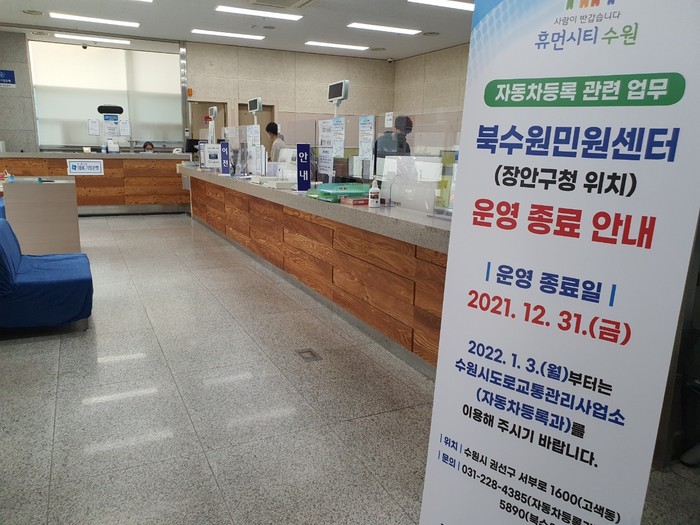 [로컬세계 김병민 기자]비영업용 자동차등록 관련 업무를 하는 경기 수원시 북수원민원센터가 12월 31일 운영을 종료한다.