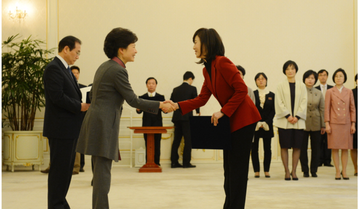 ▲박근혜 대통령이 조윤선 신임 여성가족부 장관에게 임명장을 주고 있다. 사진출처 청와대. |