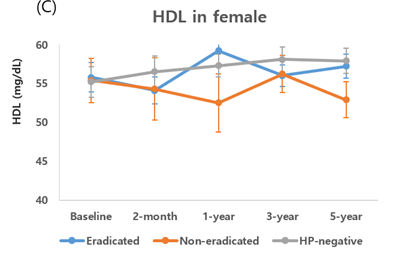 -HDL콜레스테롤, 여성에서 헬리코박터 제균 치료 후 1년 뒤 유의미한 개선 효과 보여