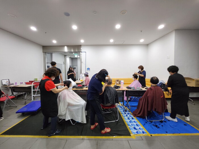 ▲ 강북구 봉사단체 회원들이 미용 봉사활동을 진행하고 있는 모습. |