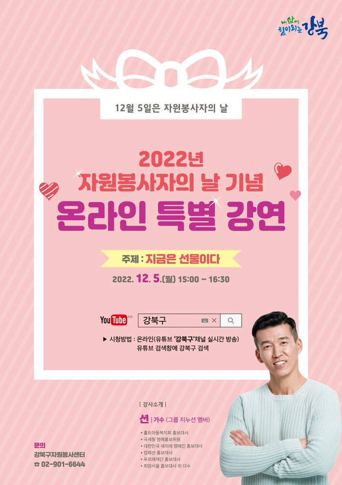 먼저 5일 오후 3시 ‘온라인 자원봉사 특강’을 개최한다. 특강은 ‘지금은 선물이다’를 주제로 그룹 지누션의 멤버 가수 션이 진행한다. 자원봉사에 관심있는 자라면 누구나 강북구 유튜브채널에서 실시간으로 시청할 수 있다.
