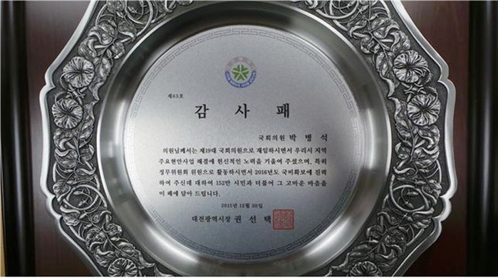 권선택 대전시장은 박 의원에 대해 “대전시 지역 주요현안사업 해결에 헌신적인 노력을 기울여 왔다”며 “2016년도 국비확보에 진력해주신데 대해 152만 시민과 더불어 그 고마운 마음을 담았다”고 말했다.