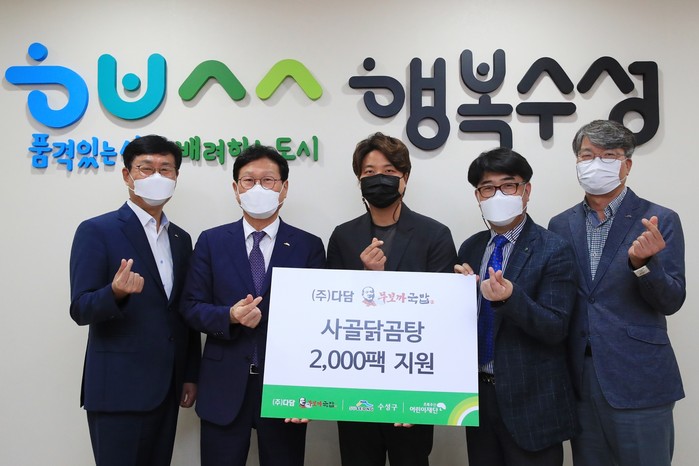 [로컬세계 박세환 기자]대구 수성구는 지난 8일 ㈜다담에서 초록우산어린이재단 대구지역본부를 통해 사골닭곰탕 2000팩(1135만원 상당)을 구에 전달했다고 9일 밝혔다.