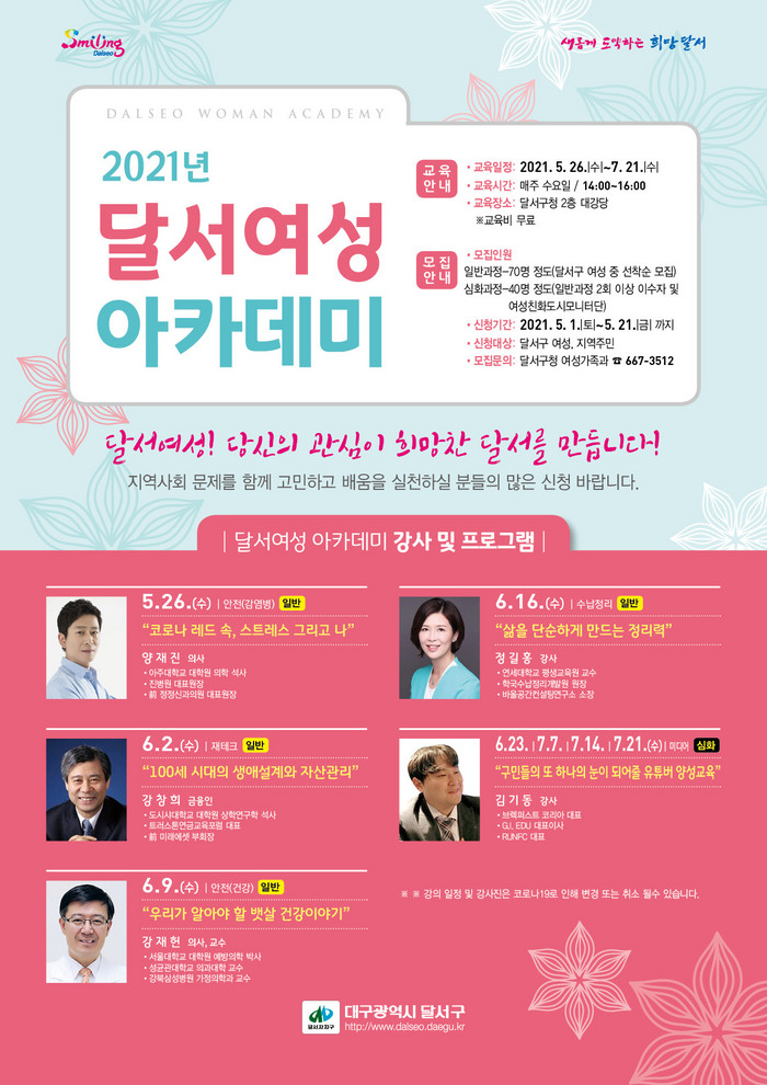이번 아카데미는 5월 26일부터 7월 21일까지 매주 수요일 오후 2시에 구청 2층 대강당에서 진행되며, 달서구 여성 중 사전신청자들만 수강가능하다.
