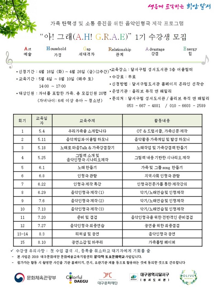 이태훈 달서구청장은 “가족간의 소통 부재, 타인에 대한 배려가 부족한 현대사회에서 이 프로그램 운영이 가족간에 소통하고 가족문제 해결에 도움을 줄 것으로 기대한다”며 “다양한 예술문화 경험으로 주민들의 행복한 삶에 도움이 되기를 바란다”고 말했다.