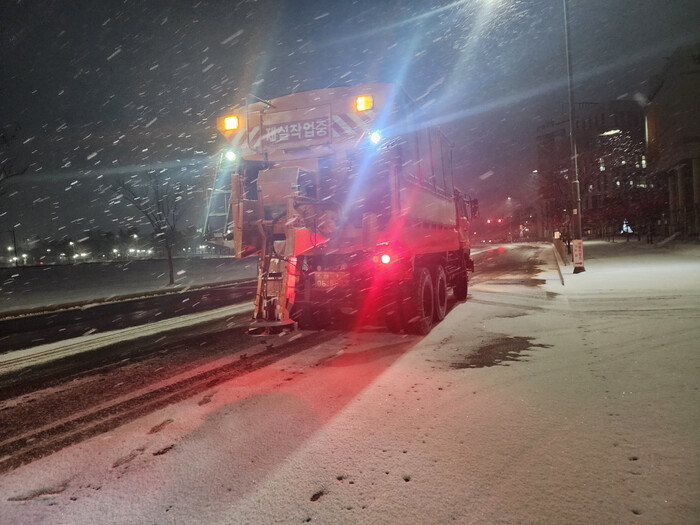먼저 484톤의 제설재와 8대의 염수분사장치, 덤프트럭, 화물트럭, 굴삭기 등 57대의 장비를 동원해 주요도로와 이면도로, 횡단보도의 제설작업을 실시했다.