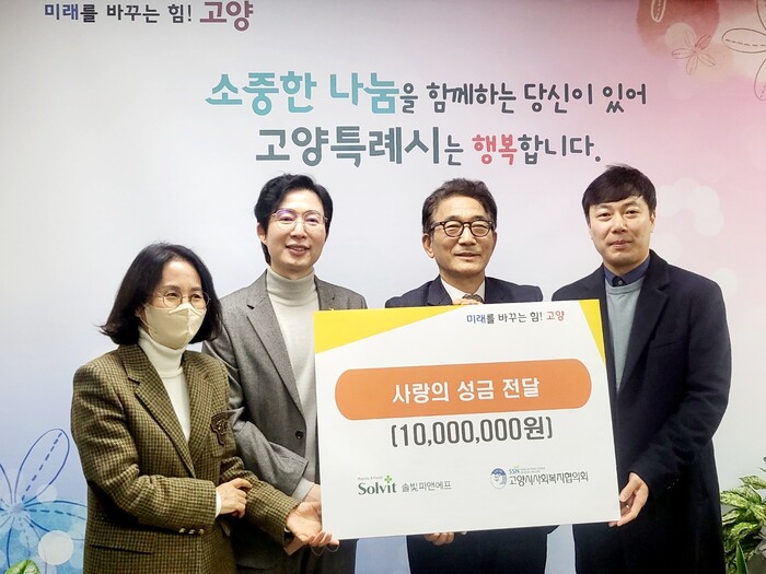 [로컬세계 = 이영원 기자]경기 고양특례시는 지난달 31일 ㈜솔빛피앤에프에서 이웃사랑 나눔을 위해 사랑의 성금 1000만원을 기부했다고 1일 밝혔다.