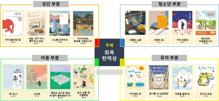 2023년도는 ‘회복탄력성’을 주제로 선정위원회의 심의를 거쳐 성인, 청소년, 아동, 유아 4개 부문에서 4권씩, 총 16권의 후보 도서를 뽑았다.