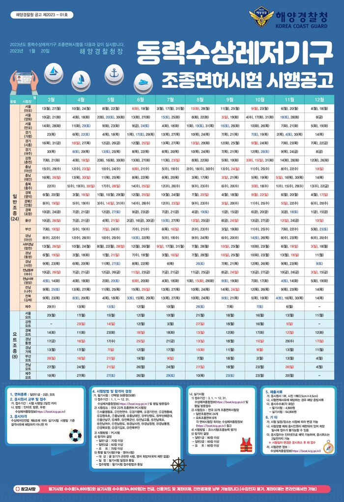 [로컬세계 = 양해수 기자]전북 군산해양경찰서는 오는 3월 1일부터 12월 31일까지 동력수상레저기구 조종면허(이하 조종면허) 시험을 시행한다고 9일 밝혔다.